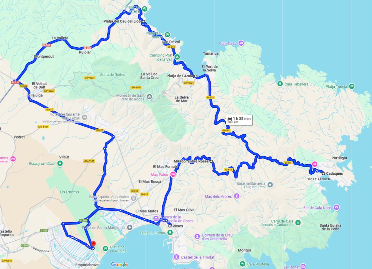 Route Camping Rubina - Rosas - Mirador Roses - Cadaques - Platja de Arola - 1 h 35 min - 68 km